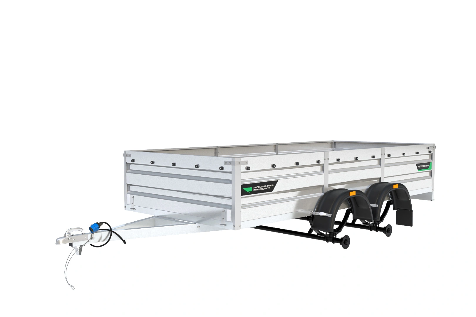 Передний и задний борт - откидные. На дно прицепа устанавливается влагостойкая фанера толщиной 9 мм.